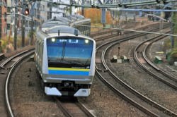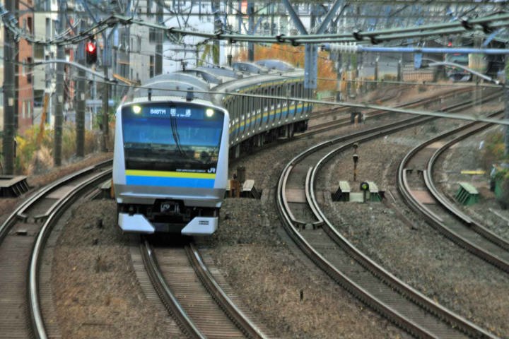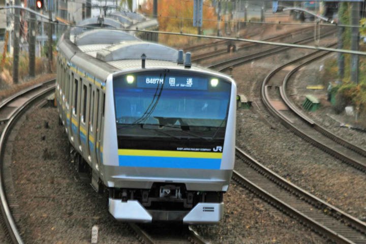 2025年12月9日 渋谷区東2の四反動跨線人道橋でJR東8487M回送E233系(塗装の変更)を撮影しました。総武線回送したので帰ろうとしましたが、9人の方は階段に座って動かないので聞きますと数分後に通過することがわかり待機することにしました。14時37分通過していきました。