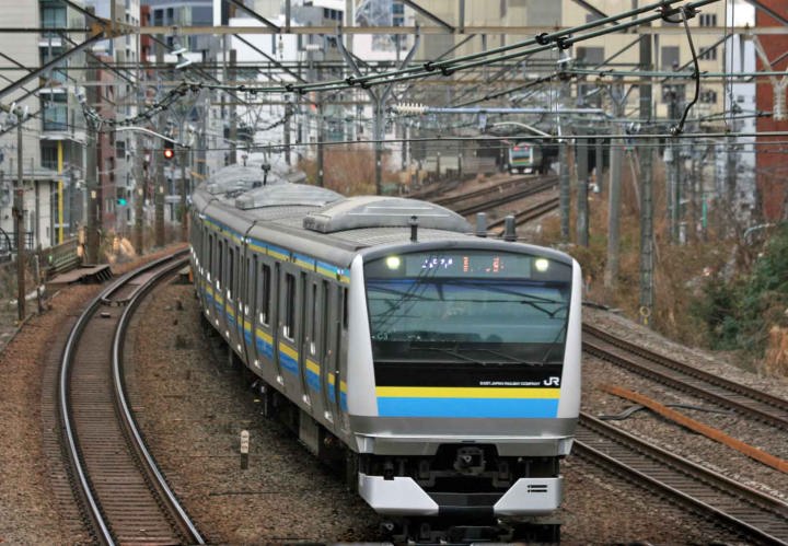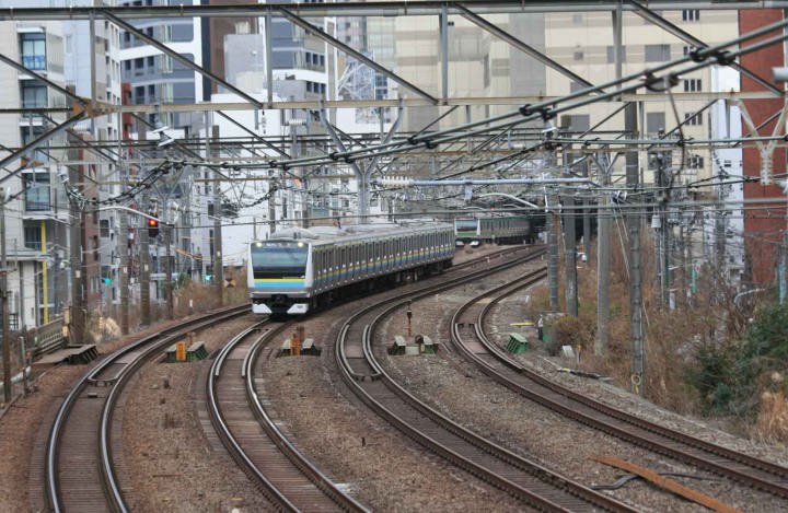2026年1月28日 E233系0番台トタH49編成6両が転用改造工事を終え千葉の幕張車両センター所属のマリC3編成となり回送されるのを東京都渋谷区東2の四反道跨線人道橋で14時37分通過するのを撮影しました。